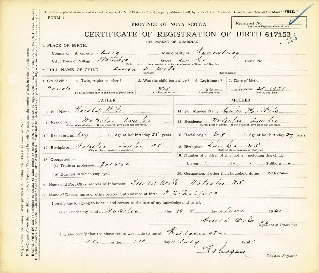 21. Name and Post Office address of Informant Harold Wile Waterloo, Lunenburg County