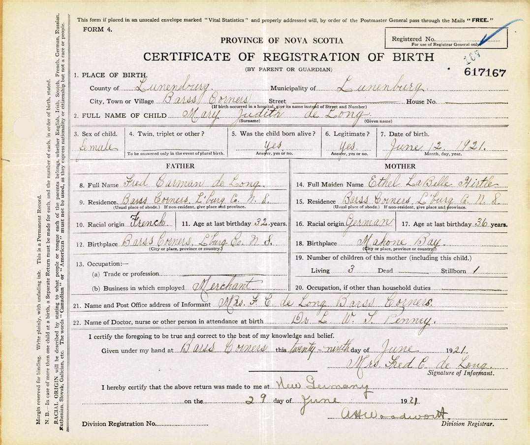 21. Name and Post Office address of Informant Mrs. F.C. de Long Barss Corners