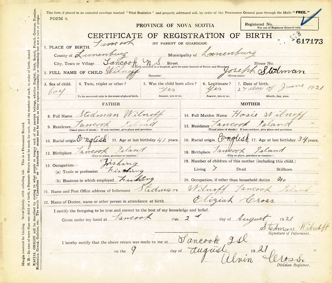 21. Name and Post Office address of Informant Stedman Wilnoff Tancook Island