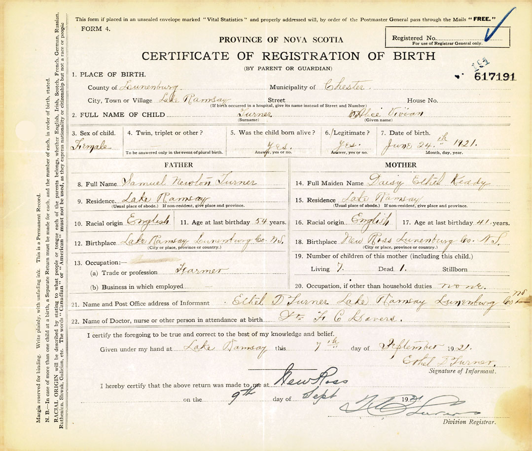 21. Name and Post Office address of Informant Ethel D. Turner Lake Ramsay, Lunenburg County, Nova Scotia
