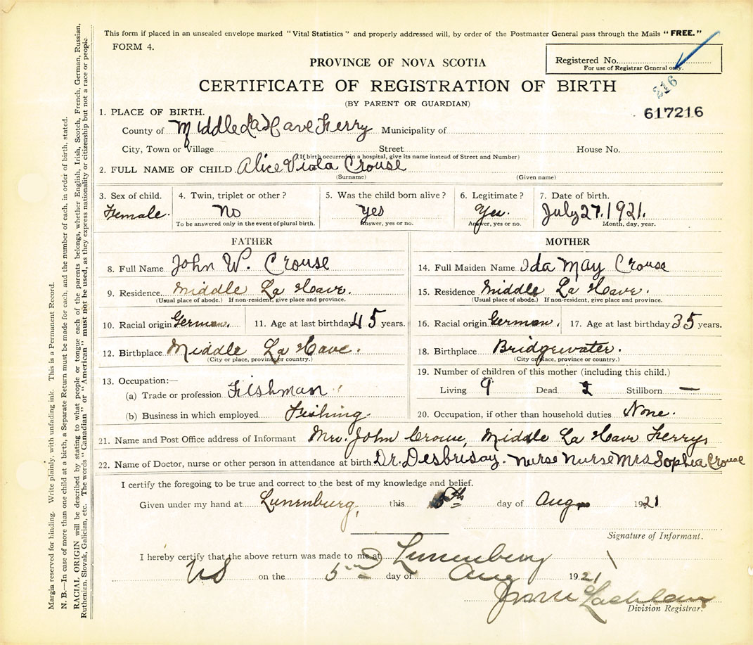 21. Name and Post Office address of Informant Mrs. John Crouse Middle La Have Ferry
