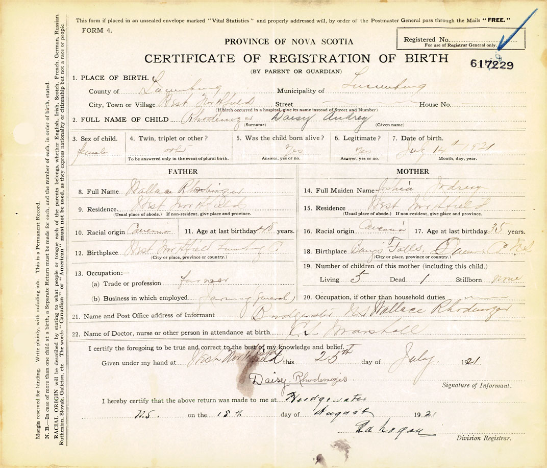 21. Name and Post Office address of Informant Wallace / Daisy? Rhodenizer Bridgewater