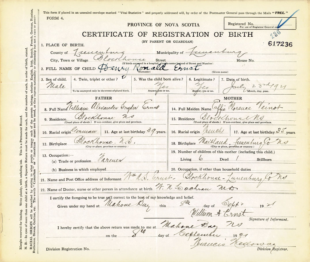 21. Name and Post Office address of Informant Wm A.S. Ernst Blockhouse Lunenburg N.S.