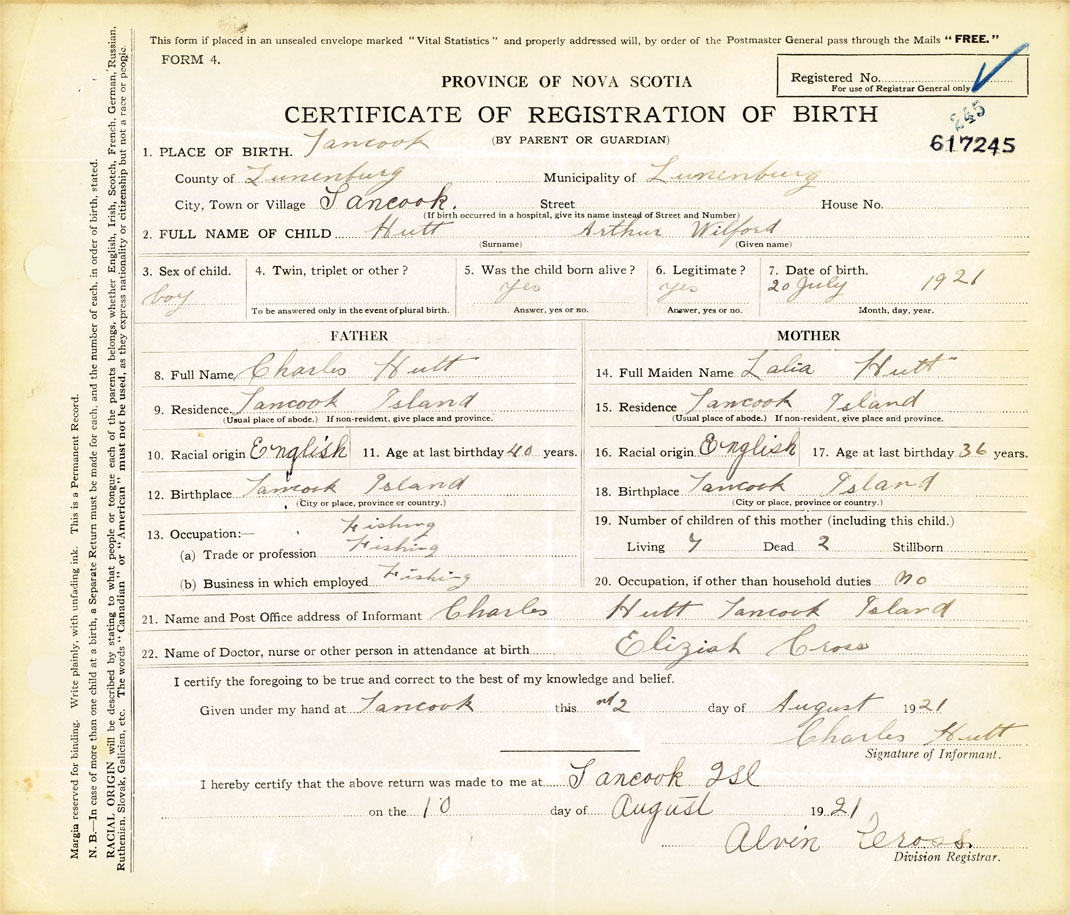 21. Name and Post Office address of Informant Charles Hutt Tancook Island
