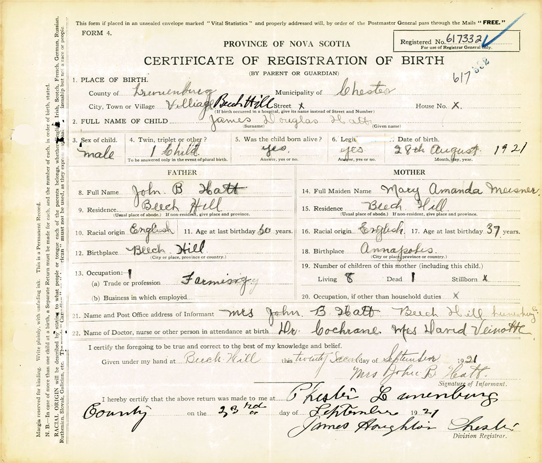 21. Name and Post Office address of Informant Mrs John B Hatt Beech Hill, Lunenburg Co
