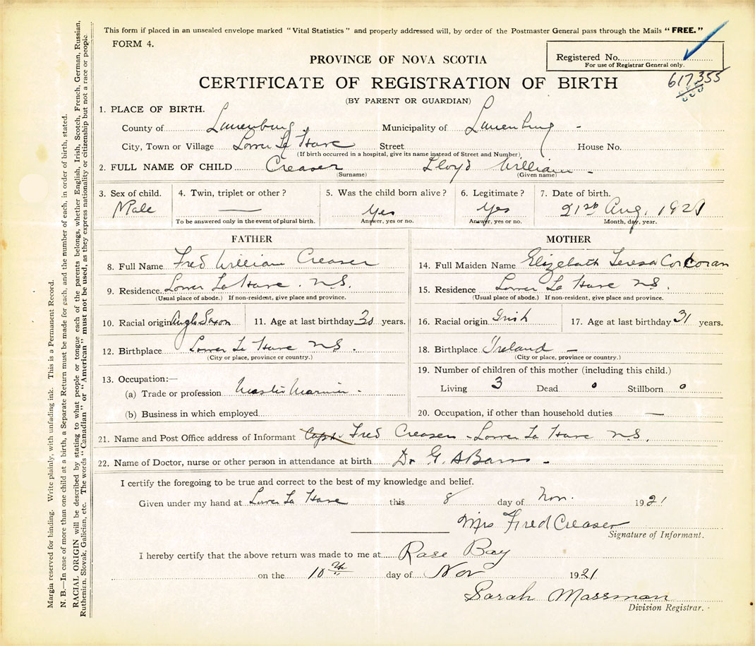 21. Name and Post Office address of Informant Fred Creaser Lower La Have