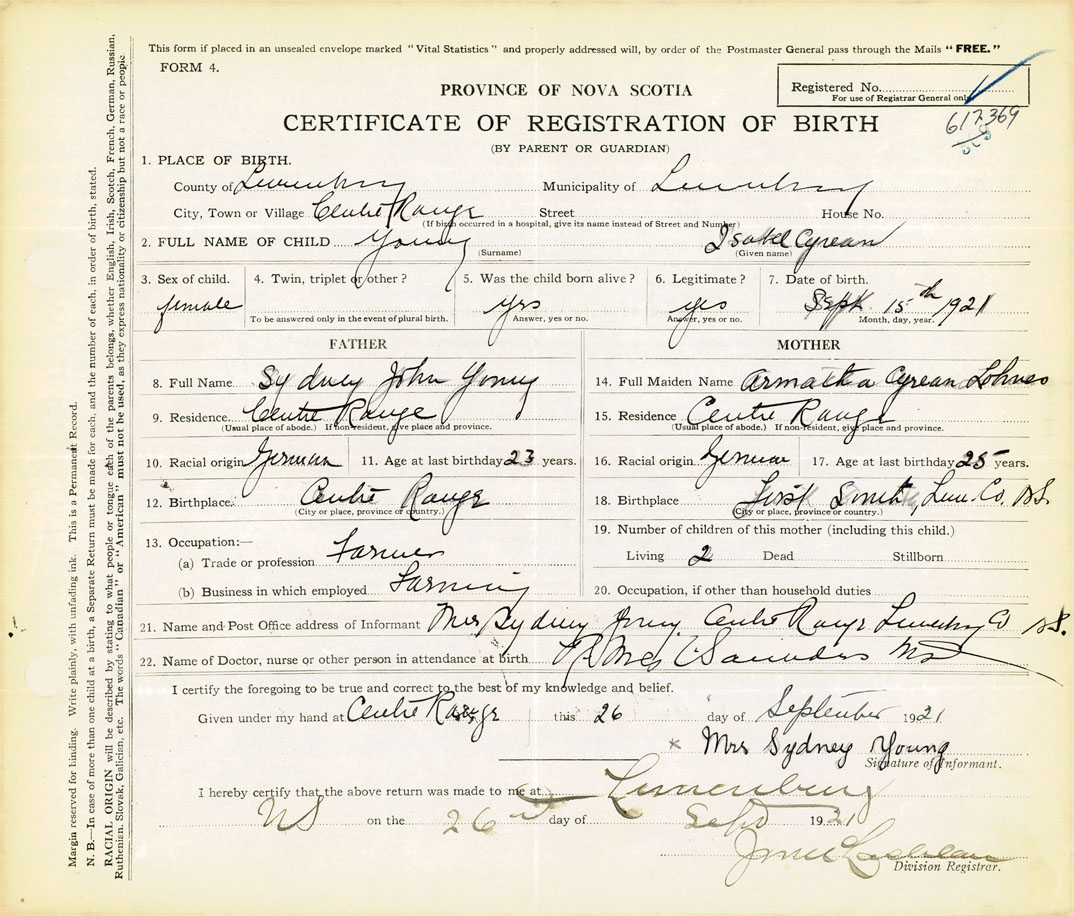21. Name and Post Office address of Informant Mrs Sydney Young Centre Rouge, Lunenburg N.S,