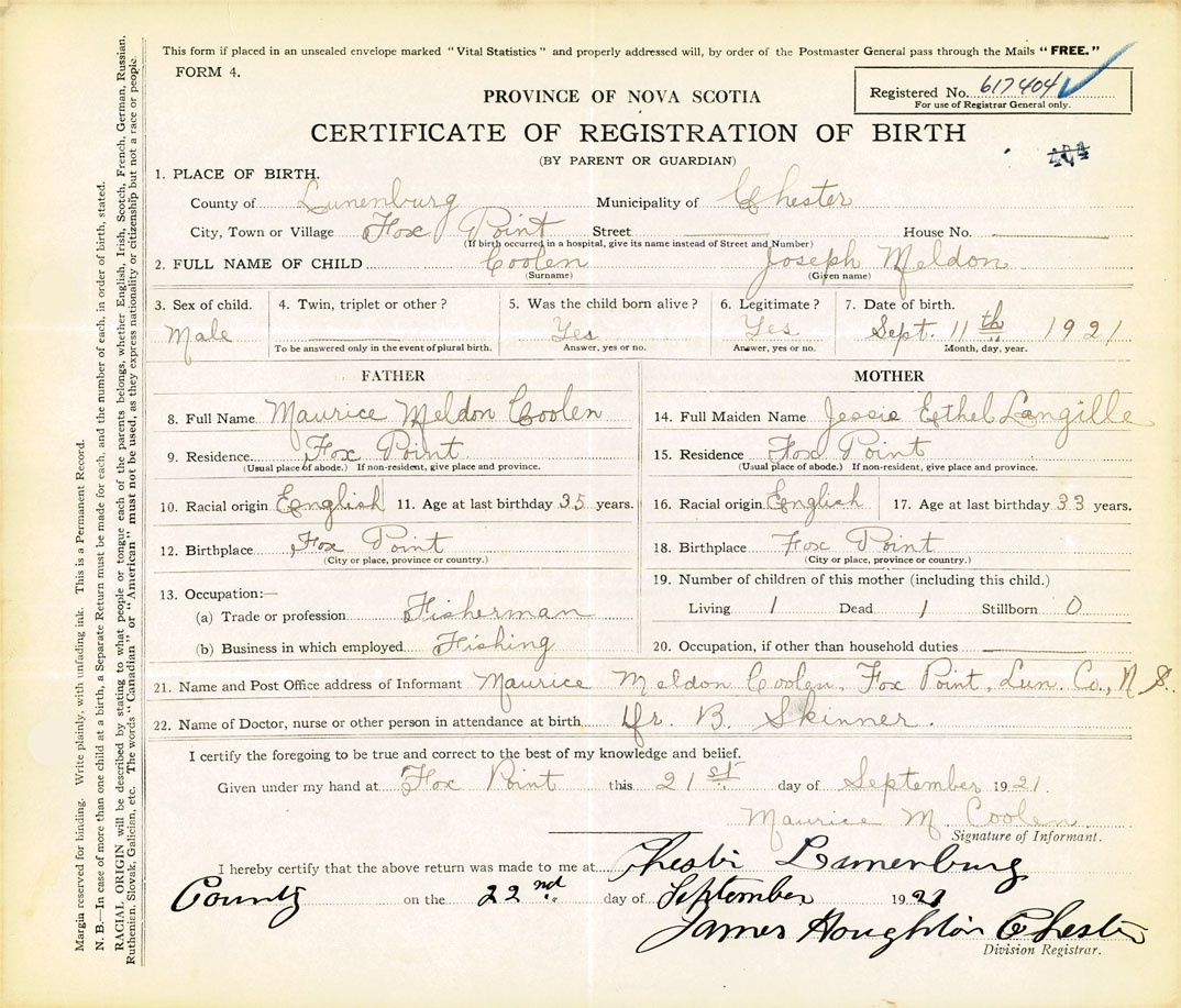 21. Name and Post Office address of Informant Maurice Meldon Coolen Fox Point, Lunenburg