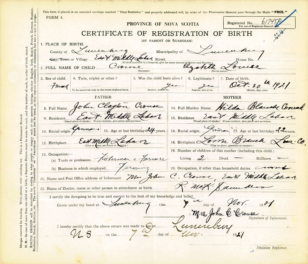 21. Name and Post Office address of Informant Mrs. John C. Crouse East Middle LaHave