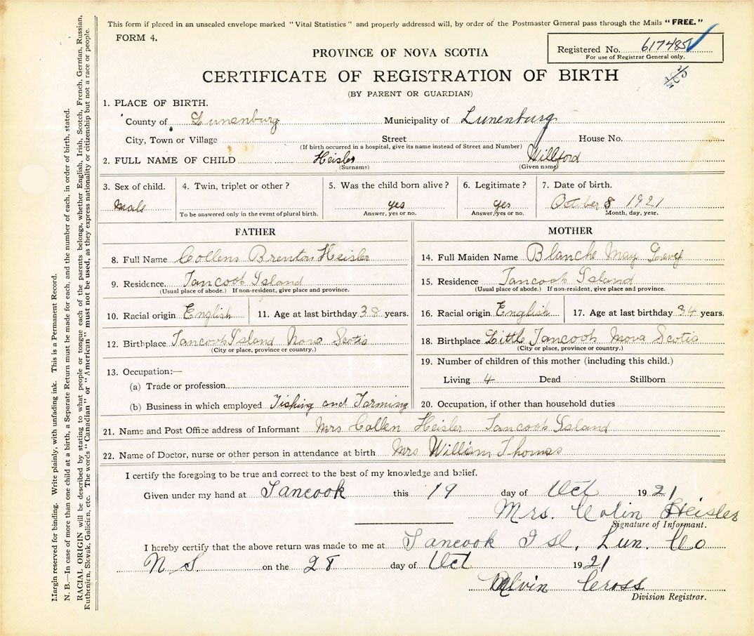 21. Name and Post Office address of Informant Mrs. Collen Heisler Tancook Island