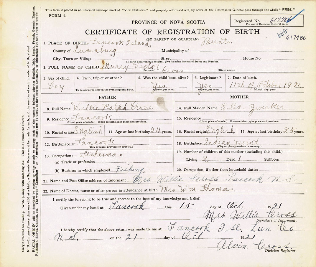 21. Name and Post Office address of Informant Mrs. Willie Cross Tancook N.S.