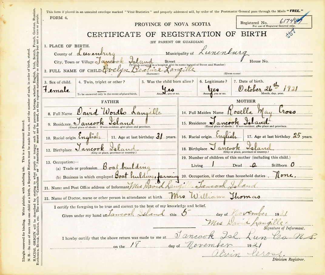 21. Name and Post Office address of Informant Mrs David Langille Tancook Island