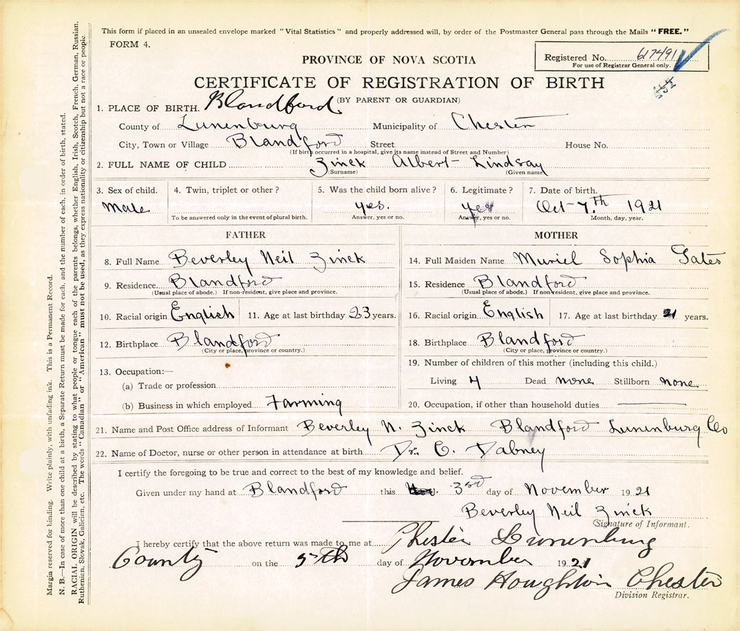 21. Name and Post Office address of Informant Beverley N. Zinck Blandford, Lunenburg