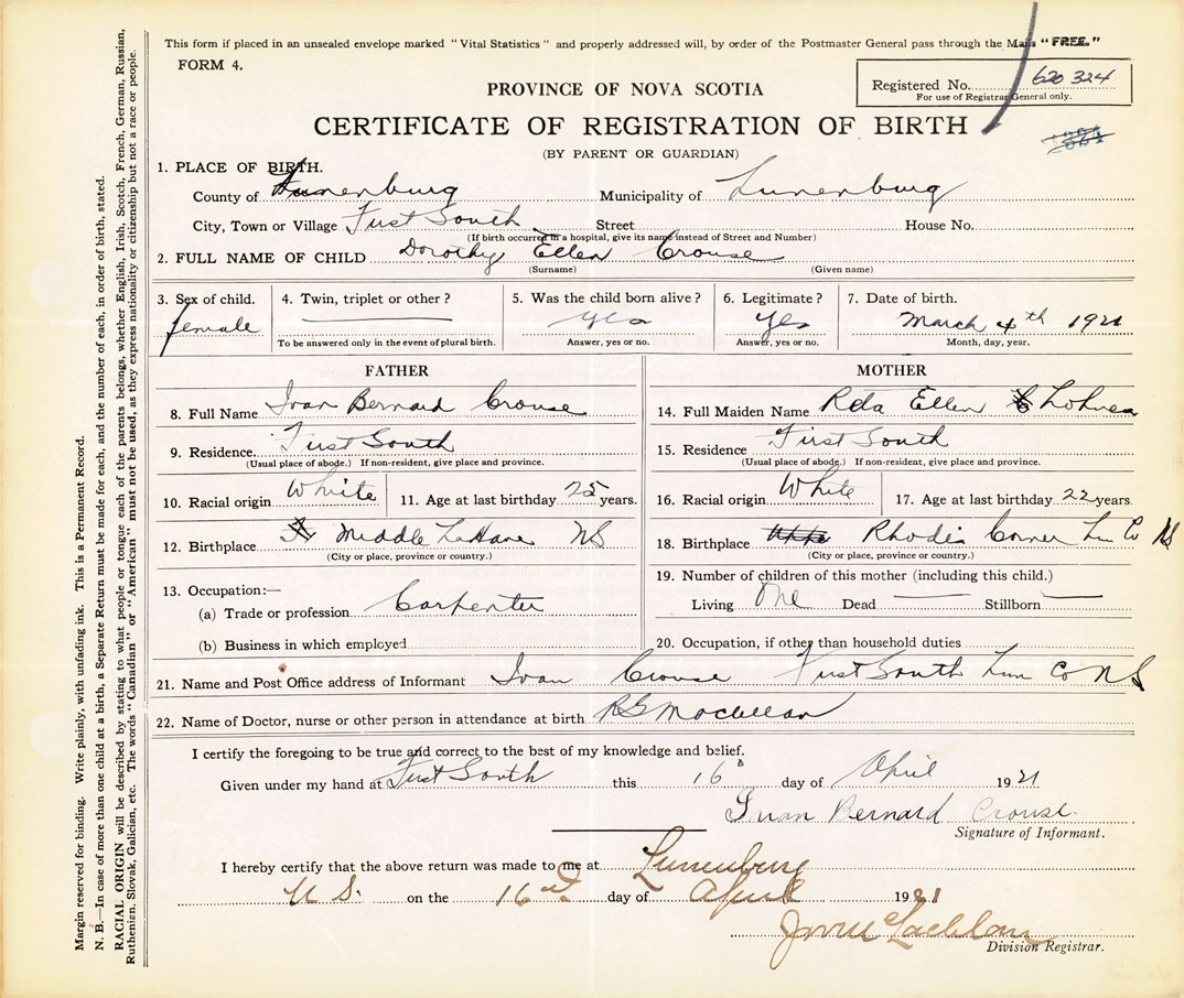 21. Name and Post Office address of Informant Ivan Crouse First South, Lunenburg Co