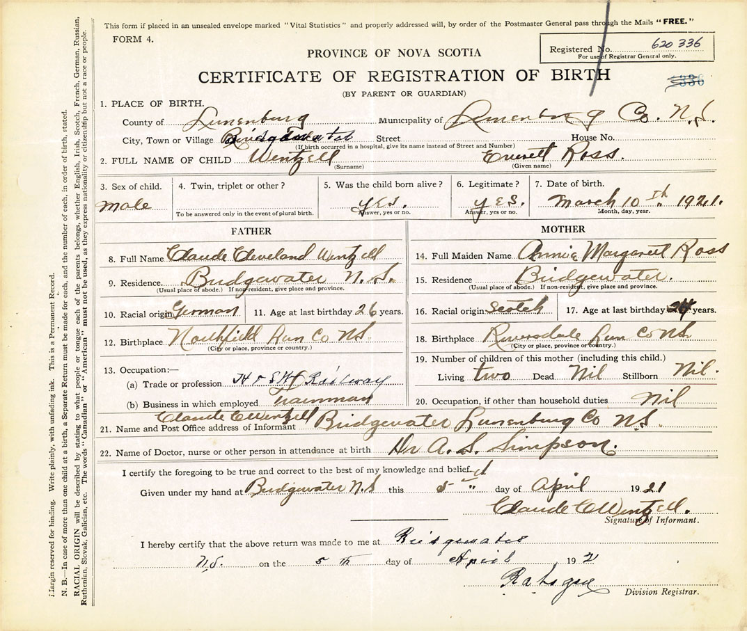 21. Name and Post Office address of Informant Claude Wentzell Bridgewater, Lunenburg