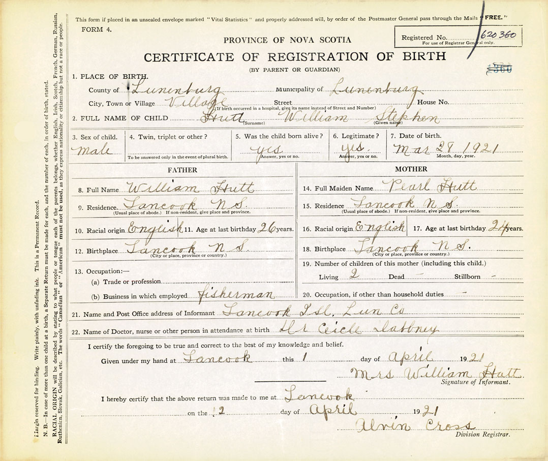 21. Name and Post Office address of Informant Mrs. William Hutt Tancook Island, Lunenburg