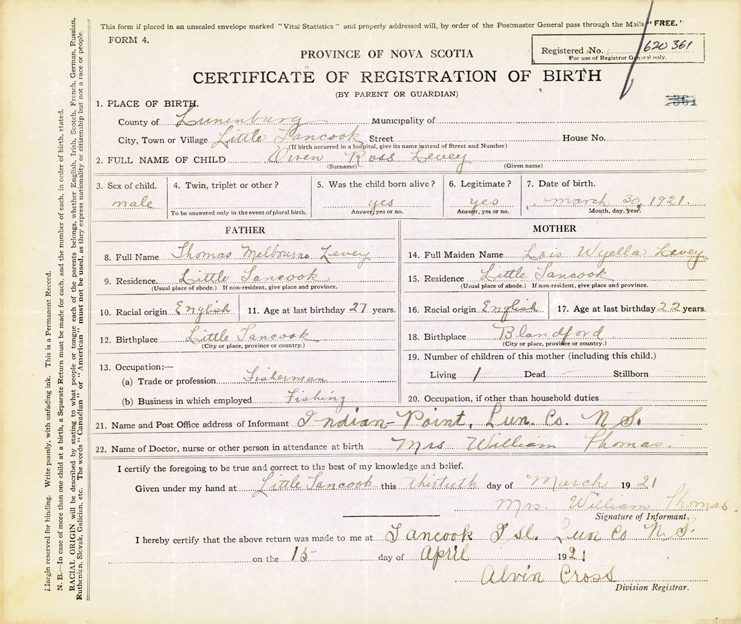21. Name and Post Office address of Informant Mrs. William Thomas Indian Point, Lunenburg Nova Scotia