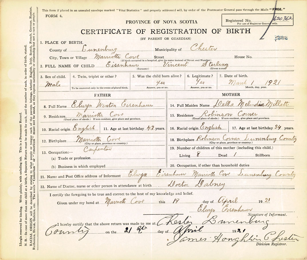 21. Name and Post Office address of Informant Elwyn Eisenhaur Marriotts Cove, Lunenburg County
