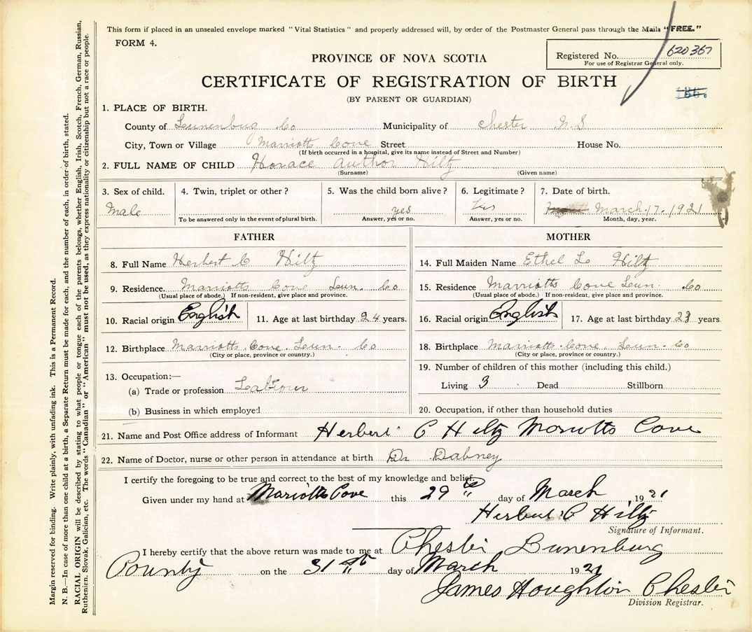 21. Name and Post Office address of Informant Herbert C Hiltz Marriotts Cove