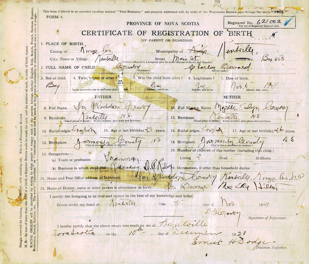 21. Name and Post Office address of Informant Don Gladstone Crosby Kentville, N.S.