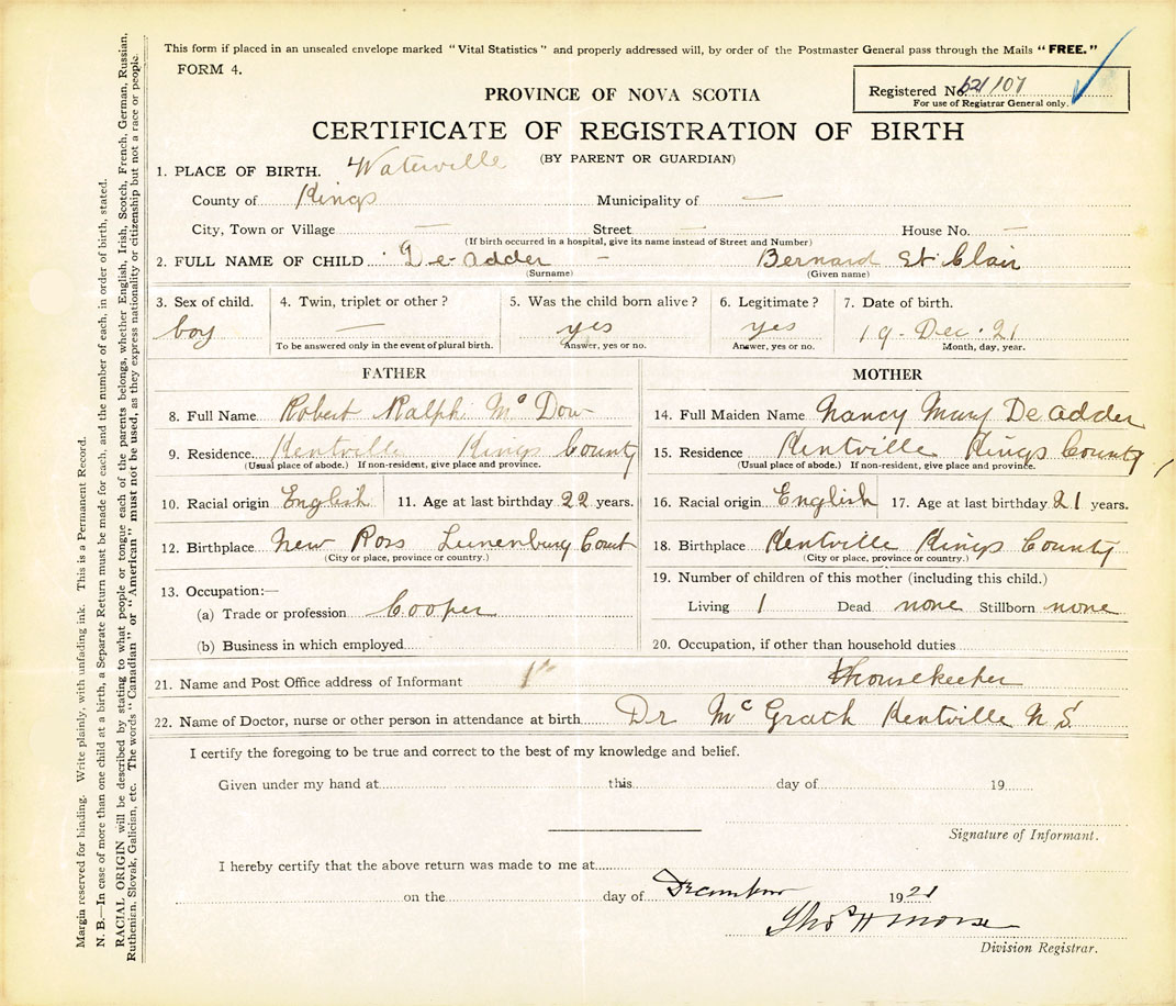 22. Name of Doctor, nurse or other person in attendance at birth Dr. McGrath, Kentville