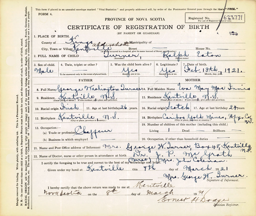21. Name and Post Office address of Informant Mrs. George W. Turner Box 48, Kentville
