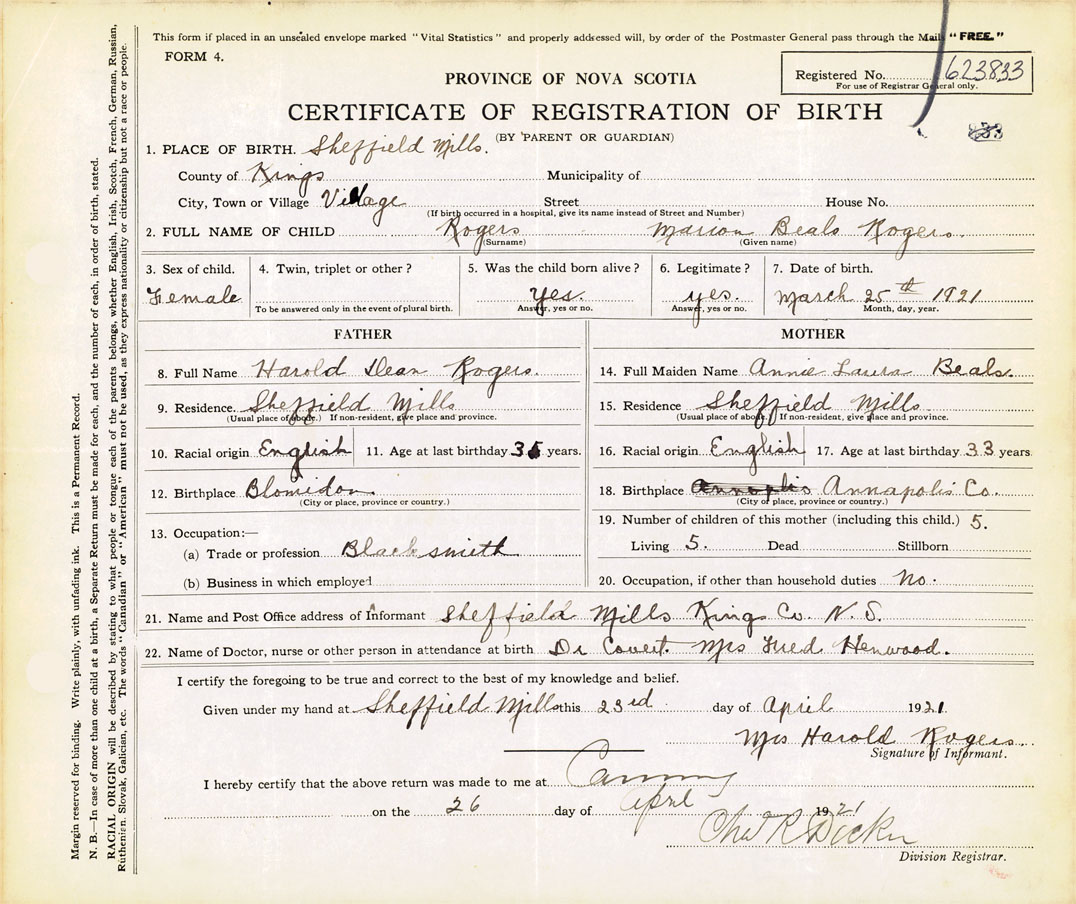 21. Name and Post Office address of Informant Mrs Harold Rogers Sheffield Mills, Kings