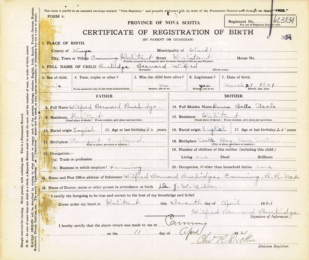 21. Name and Post Office address of Informant Wilfred Bernard Burbidge Canning, R.R. #2