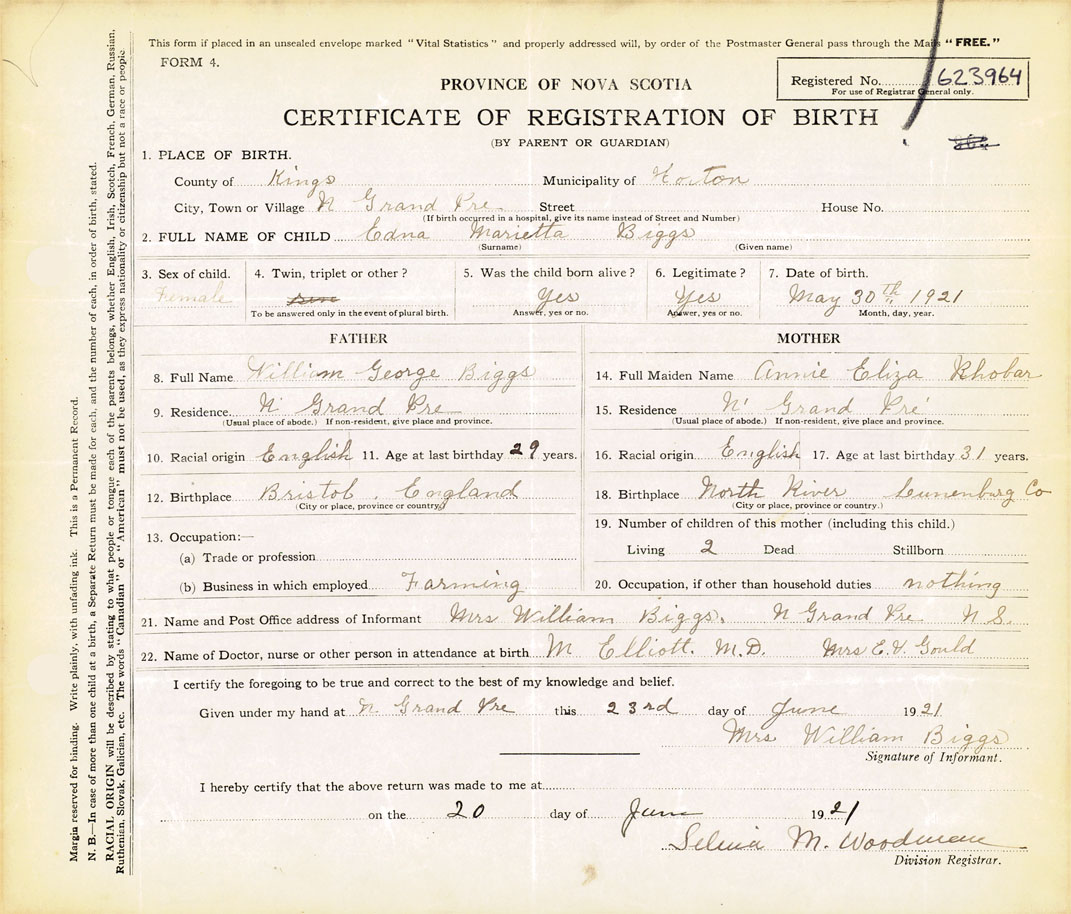 21. Name and Post Office address of Informant Mrs William Biggs N Grand Pre