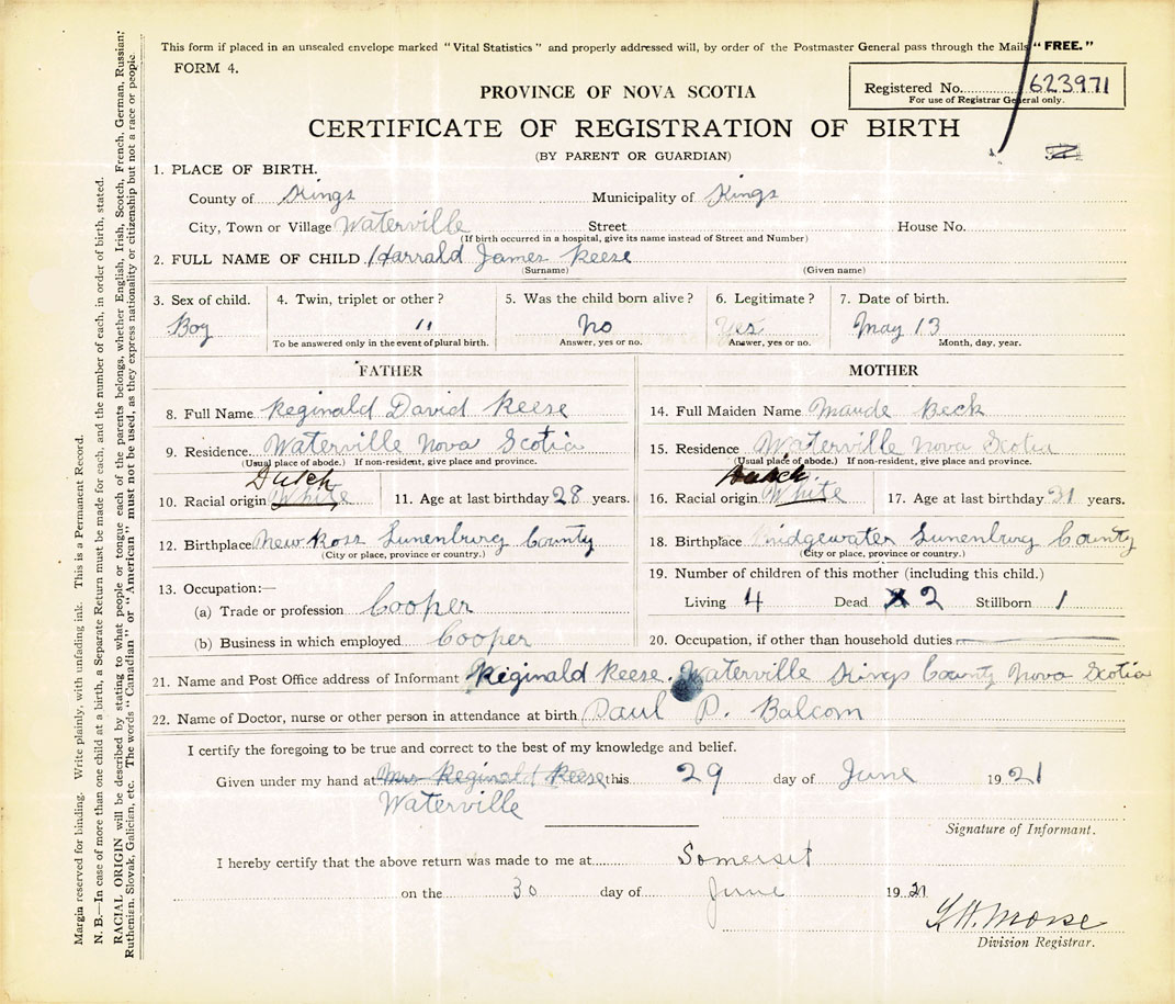 21. Name and Post Office address of Informant Reginald Reese Waterville, Kings County, Nova Scotia