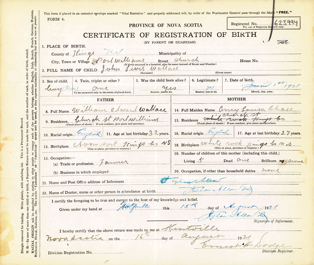 21. Name and Post Office address of Informant Glen Allan Wolfville, N.S.