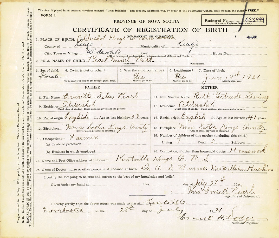 21. Name and Post Office address of Informant Mrs. Everett Pearl Kentville, Kings County