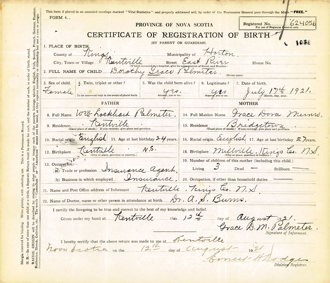 21. Name and Post Office address of Informant Grace D. M. Palmeter Kentville, Kings N.S.