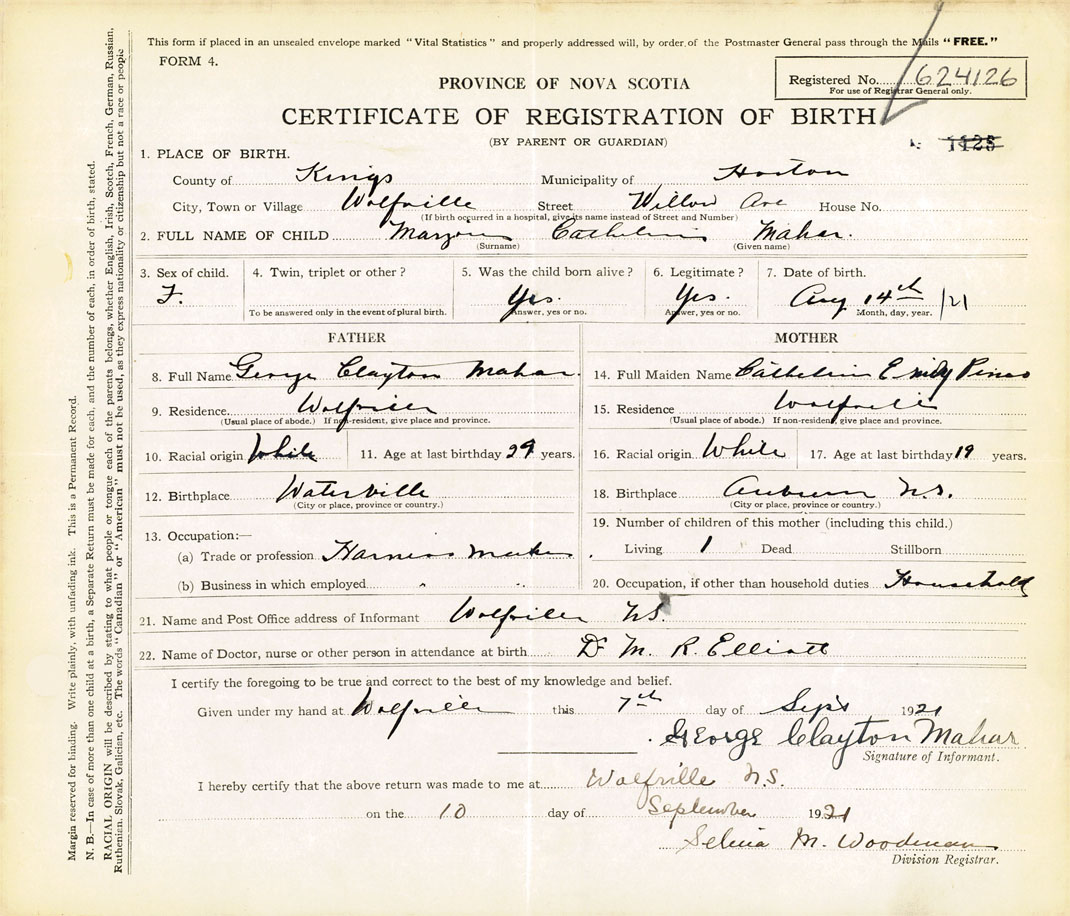 21. Name and Post Office address of Informant George Clayton Mahar Wolfville, N.S.