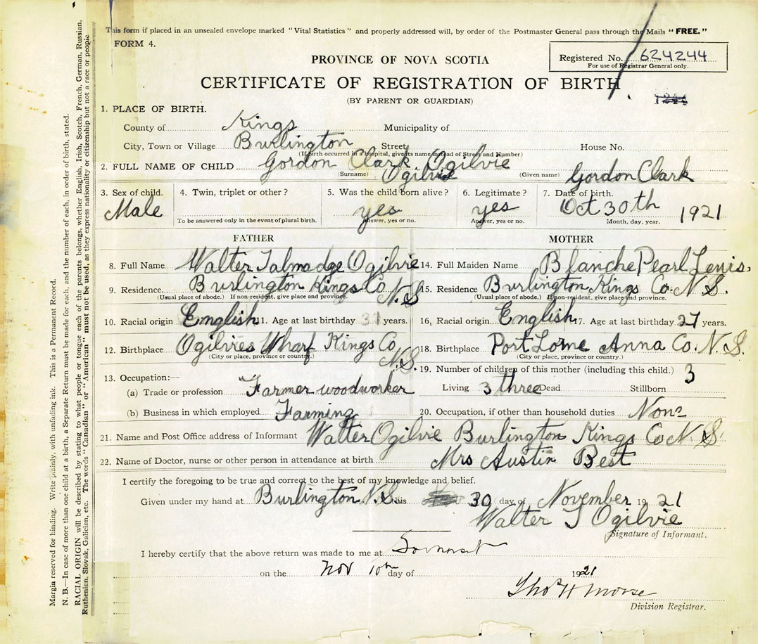21. Name and Post Office address of Informant Walter Ogilvie Burlington, Kings