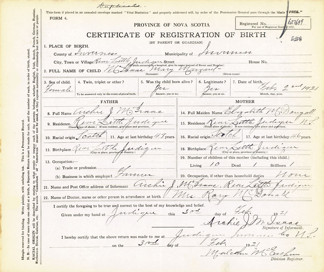 21. Name and Post Office address of Informant Archie J McIsaac Rear Little Judique