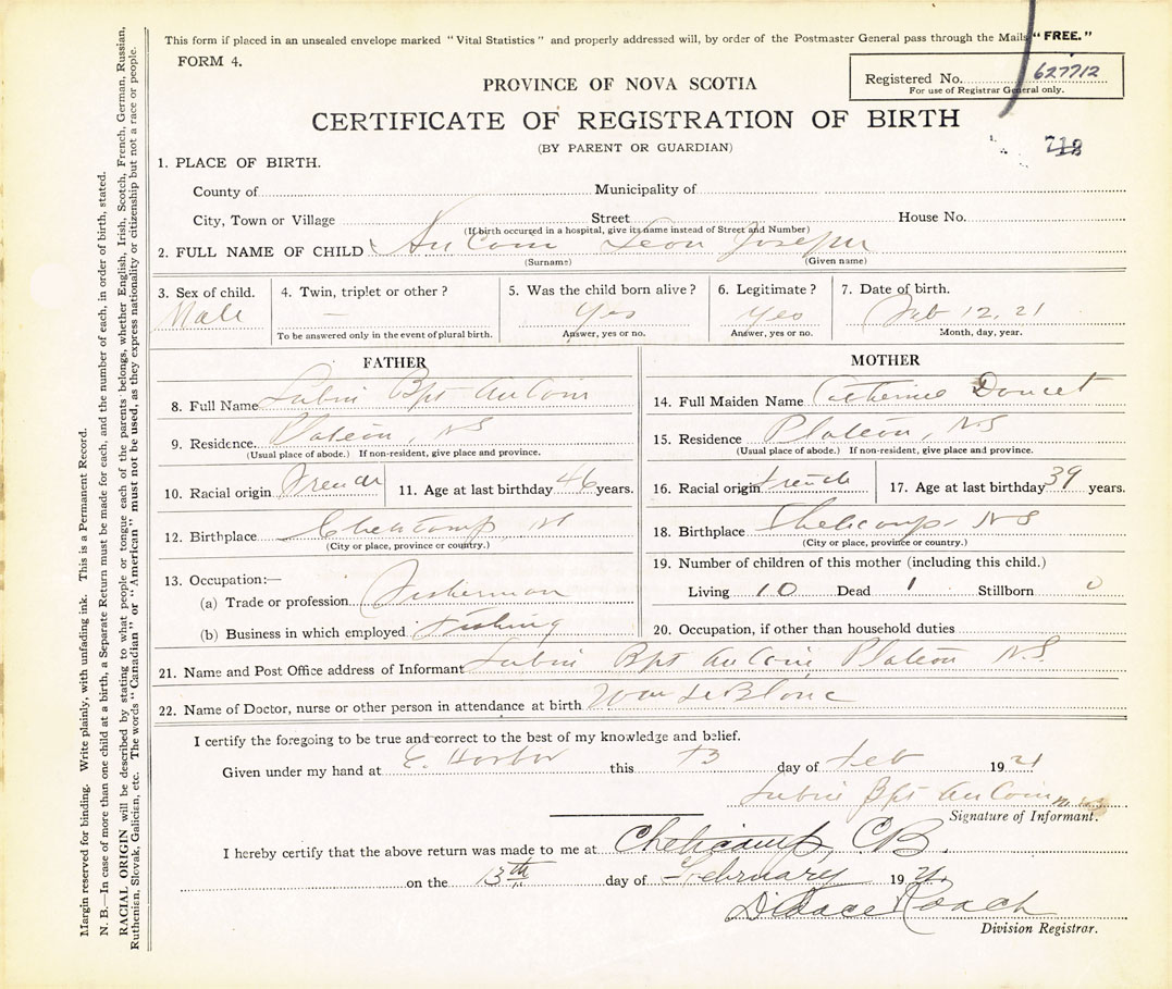 22. Name of Doctor, nurse or other person in attendance at birth William LeBlanc