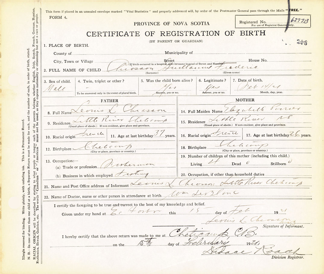 21. Name and Post Office address of Informant Leonis L. Chiasson Little River, Cheticamp