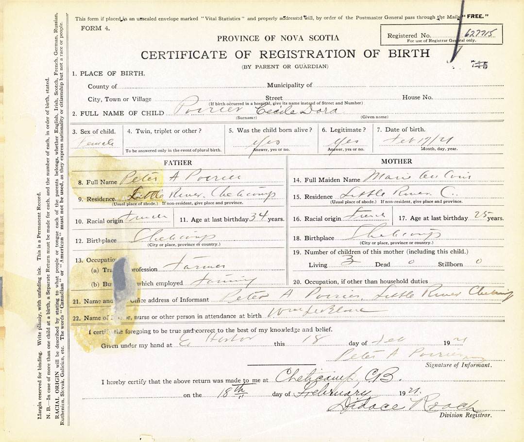 21. Name and Post Office address of Informant Peter A Poirier Little River, Cheticamp