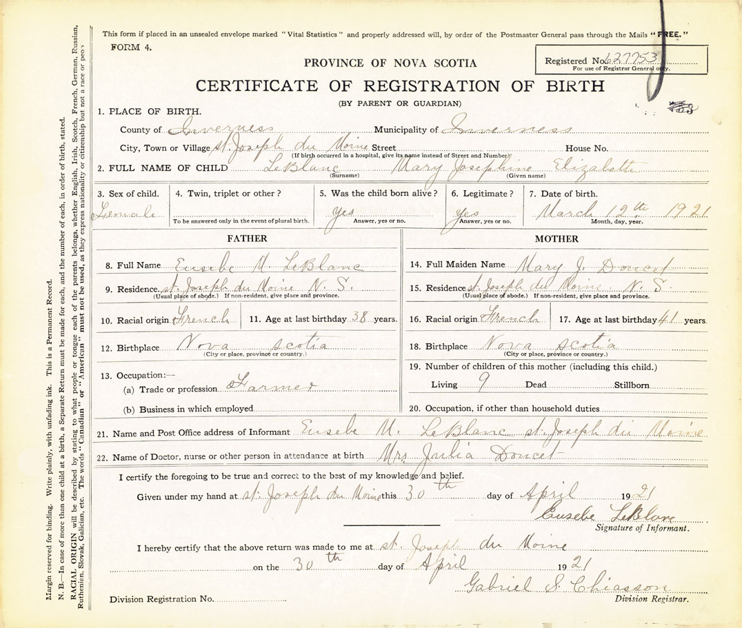 21. Name and Post Office address of Informant Eusebe M LeBlanc St. Joseph du Moine