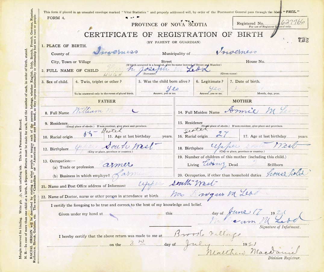 21. Name and Post Office address of Informant William MacLeod Upper South West