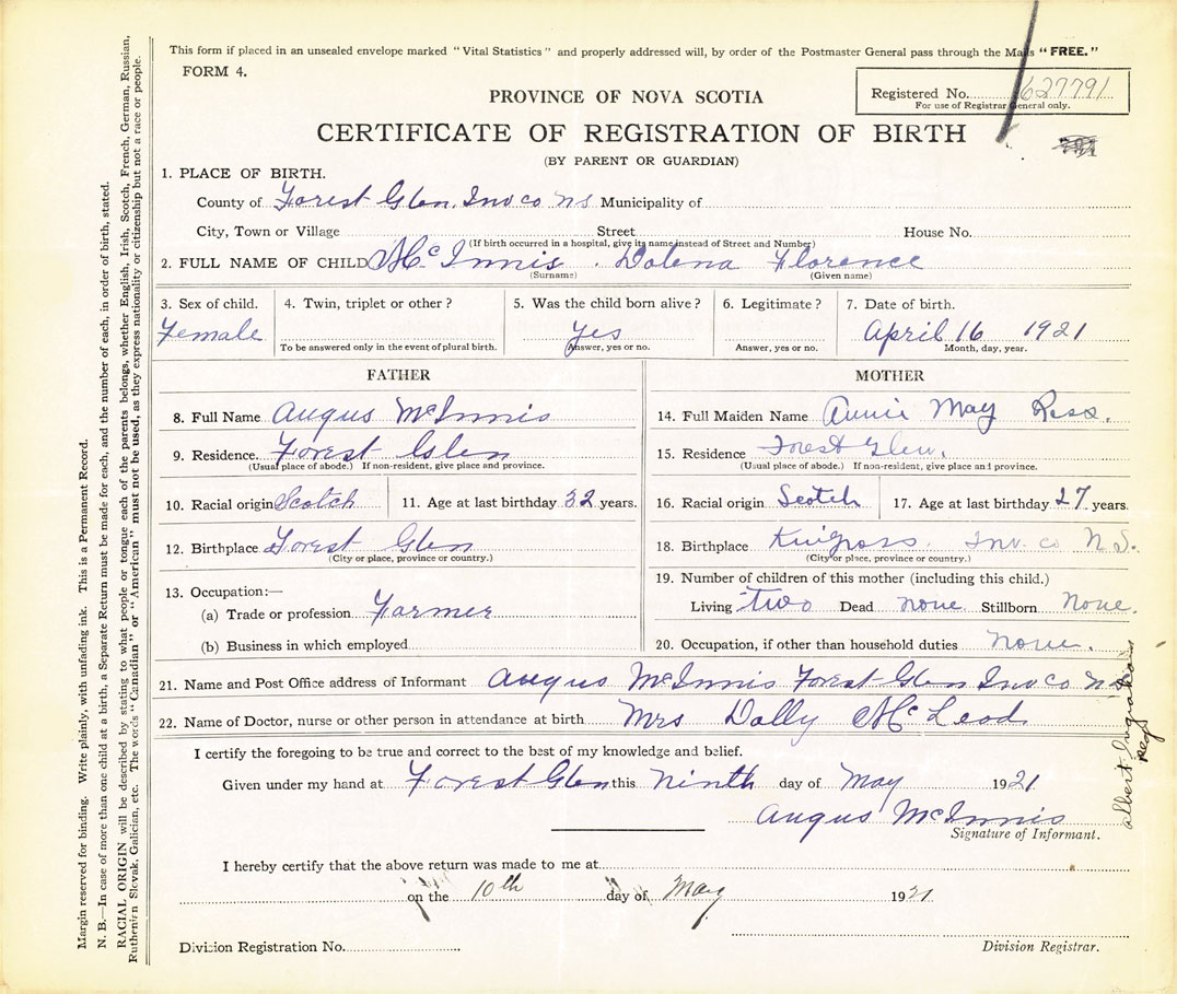 21. Name and Post Office address of Informant Angus McInnis Forest Glen, Inverness County