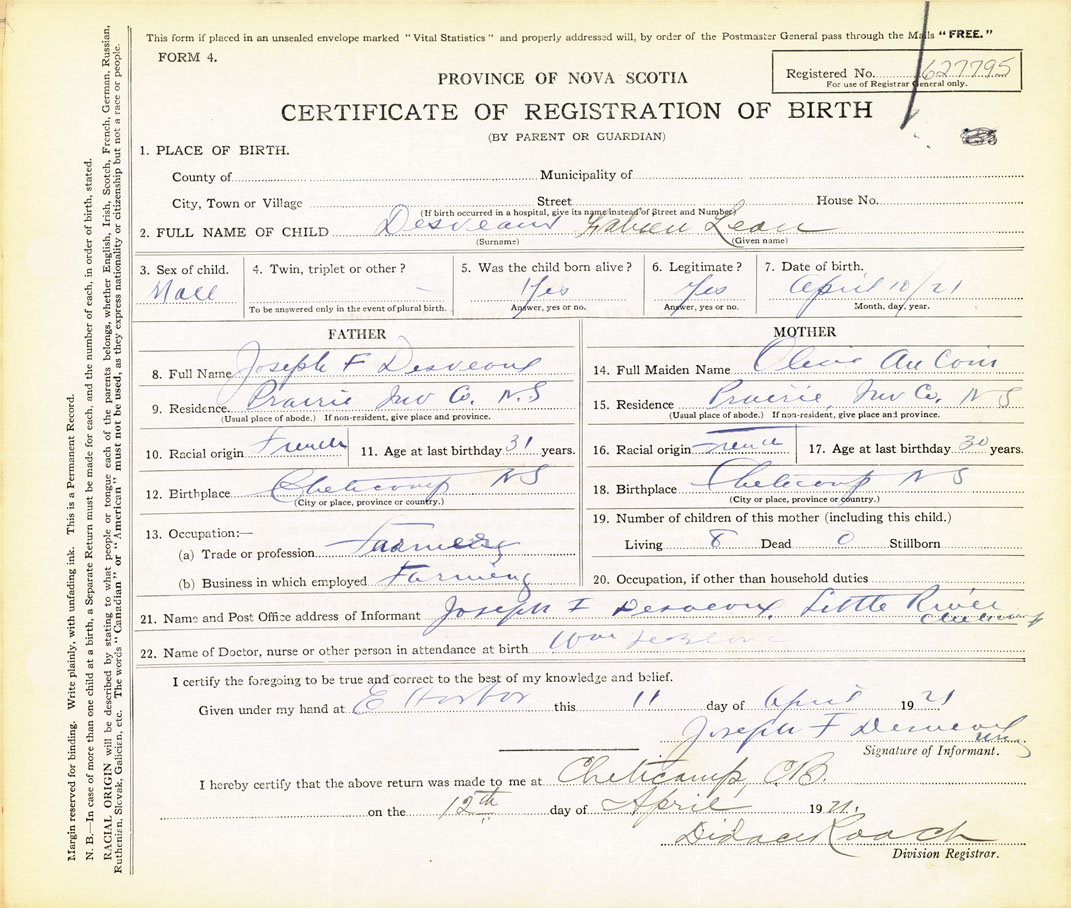 21. Name and Post Office address of Informant Joseph F. Desveaux Little River, Cheticamp