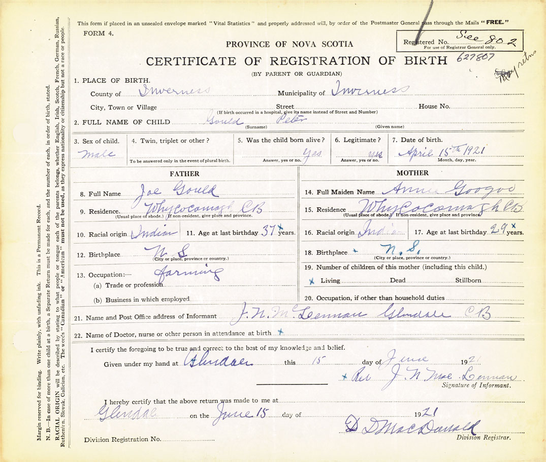 21. Name and Post Office address of Informant J.N. McLennan Glendale, C.B. (Cape Breton)
