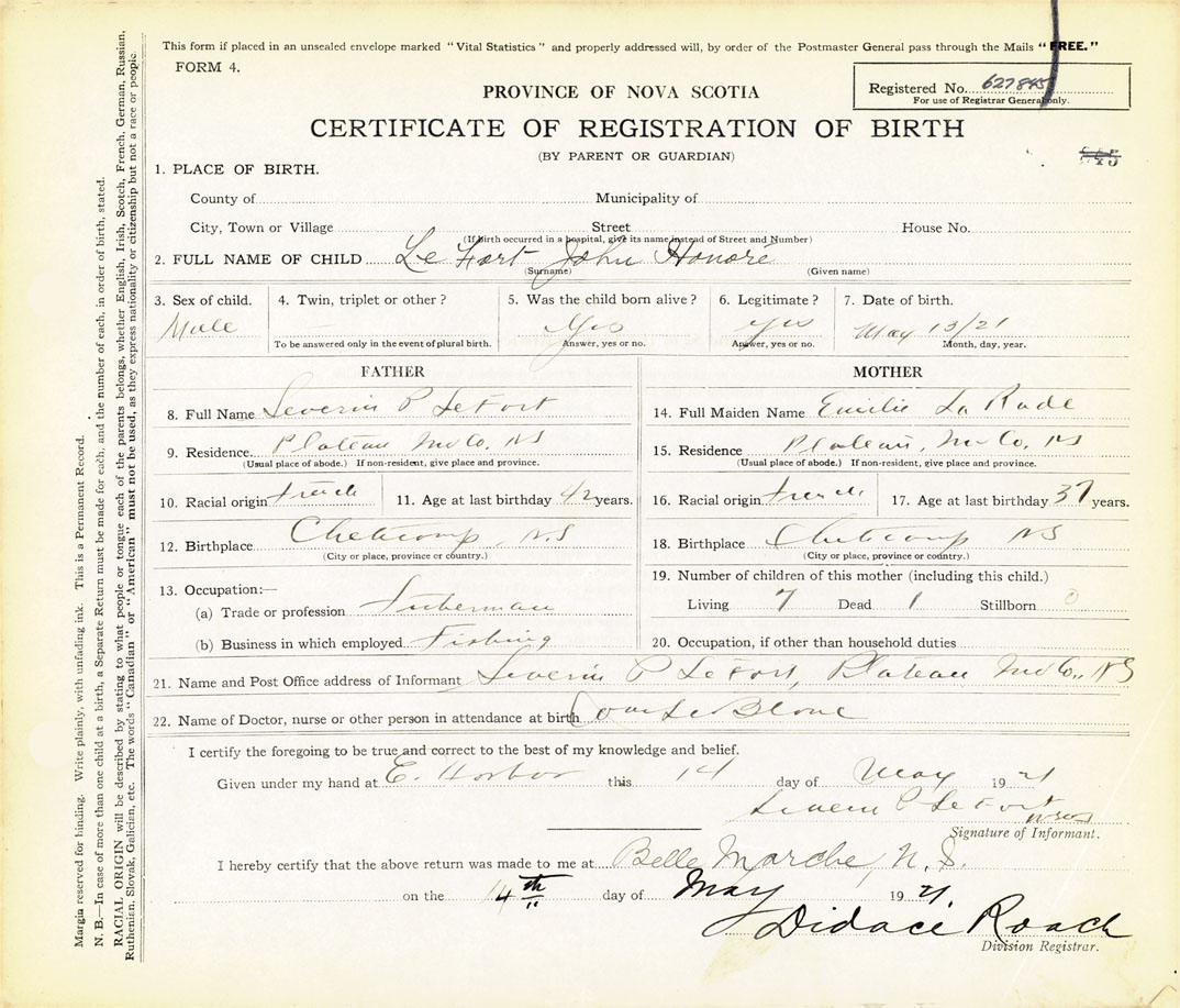 22. Name of Doctor, nurse or other person in attendance at birth William LeBlanc