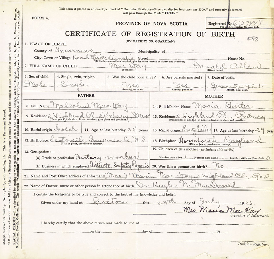 22. Name of Doctor, nurse or other person in attendance at birth Dr. Hugh N MacDonald