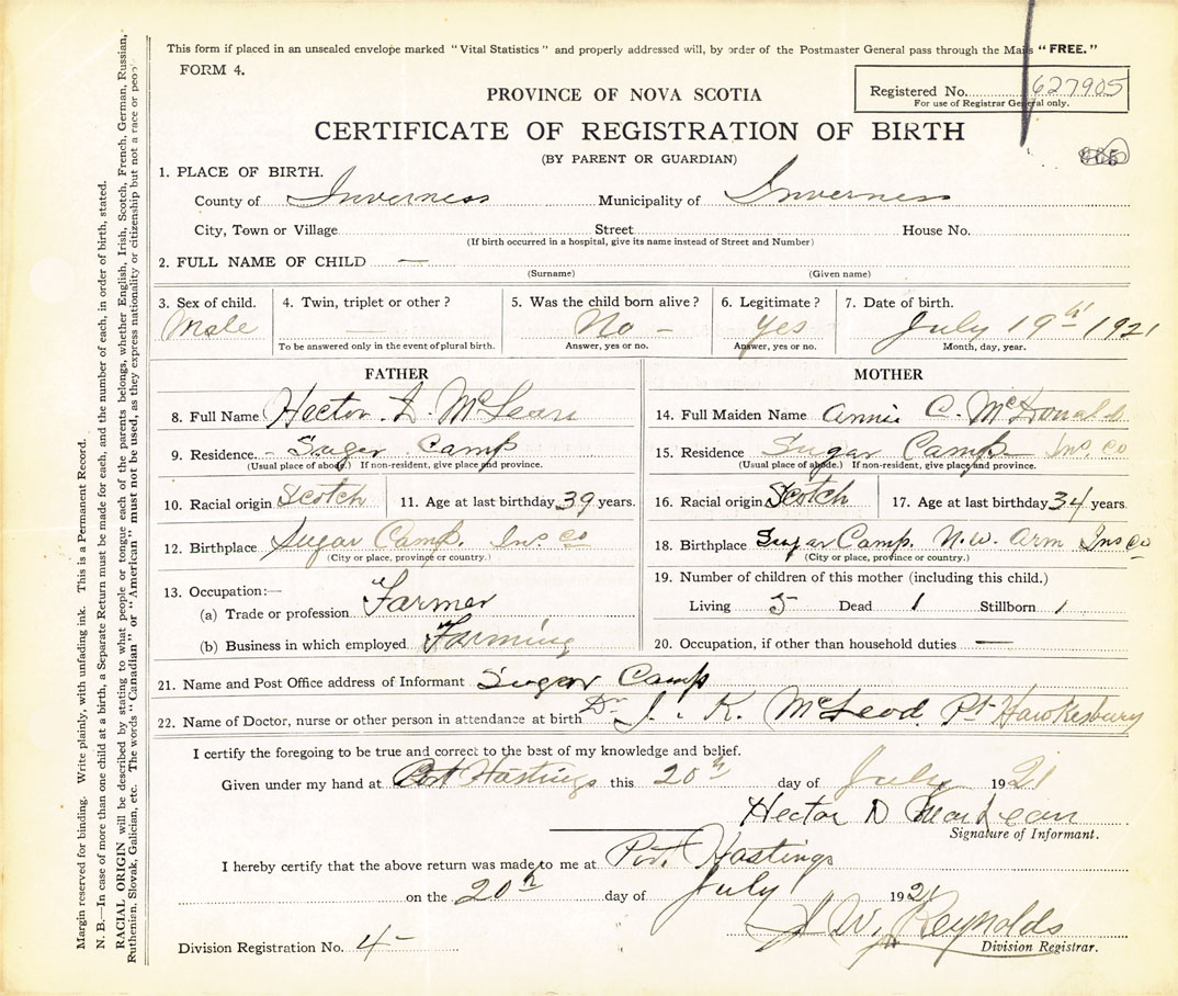 22. Name of Doctor, nurse or other person in attendance at birth Dr. J.K. McLeod , Pt Hawkesbury