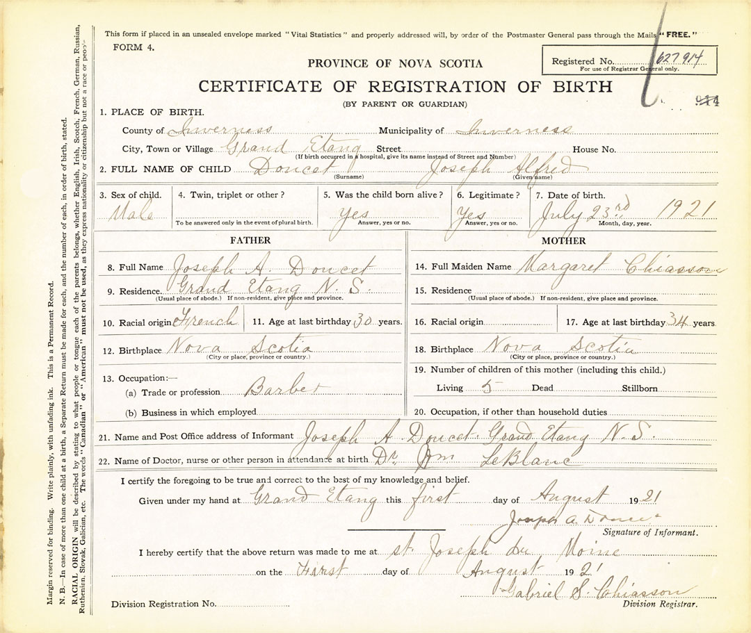 21. Name and Post Office address of Informant Joseph A Doucet Grand Etang N.S.