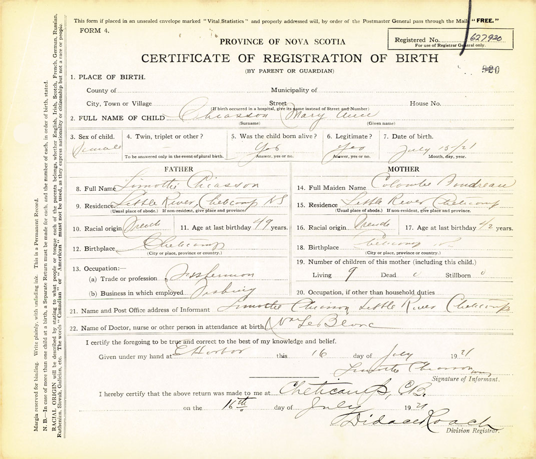 21. Name and Post Office address of Informant Timothe Chiasson Little River Cheticamp