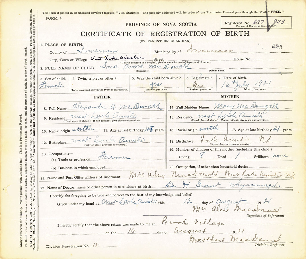 22. Name of Doctor, nurse or other person in attendance at birth Dr. H Grant, Whycocomagh